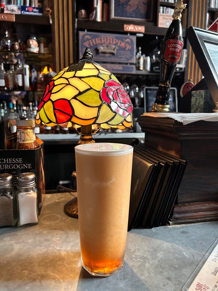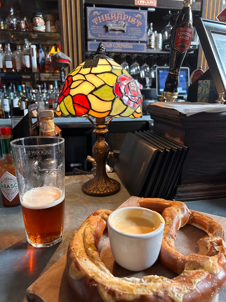I should have had a meal. I didn’t, but I did imbibe in a few pints of Old Speckled Hen (a lusciously light-brown pub ale that pours like a Guinness) and a London Pride pale ale. My wife ultimately ordered the pretzel, which came slathered with baked-on mustard and homemade beer cheese, both mind-blowing–and I’m not even a big pretzel guy.