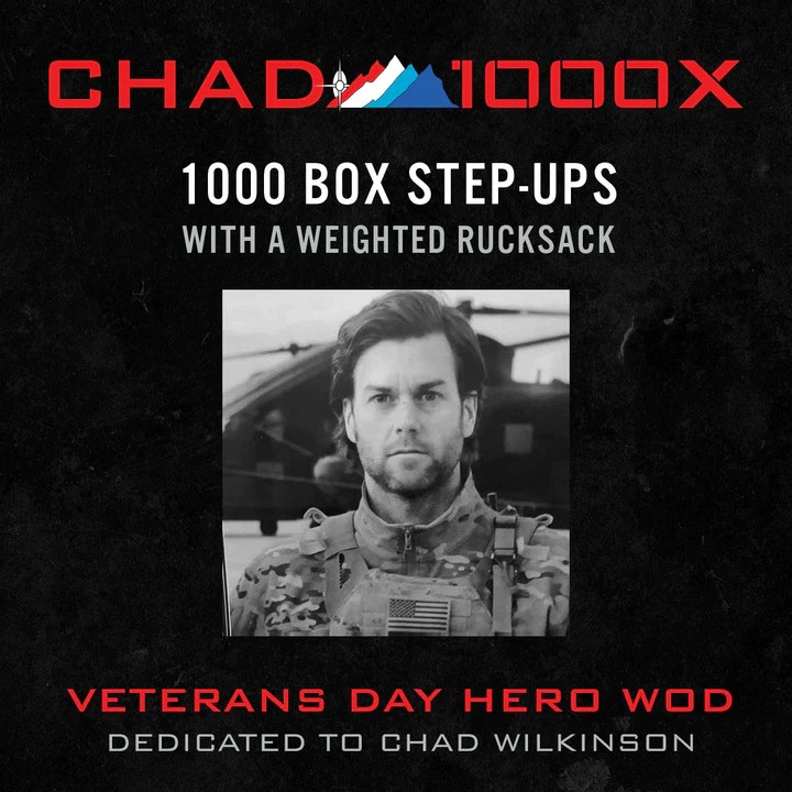 One such Hero workout is “Chad”. Usually performed on Veteran’s Day, the workout is named after Navy SEAL Chad Wilkinson “who took his life on October 29, 2018 due to the effects of numerous deployments, several TBIs, blast wave injuries and PTSD. The goal of the workout is to honor Chad’s life and legacy and to raise awareness for suicide prevention”. You can read more about the foundation behind the workout at the “Chad 1000X” page here.